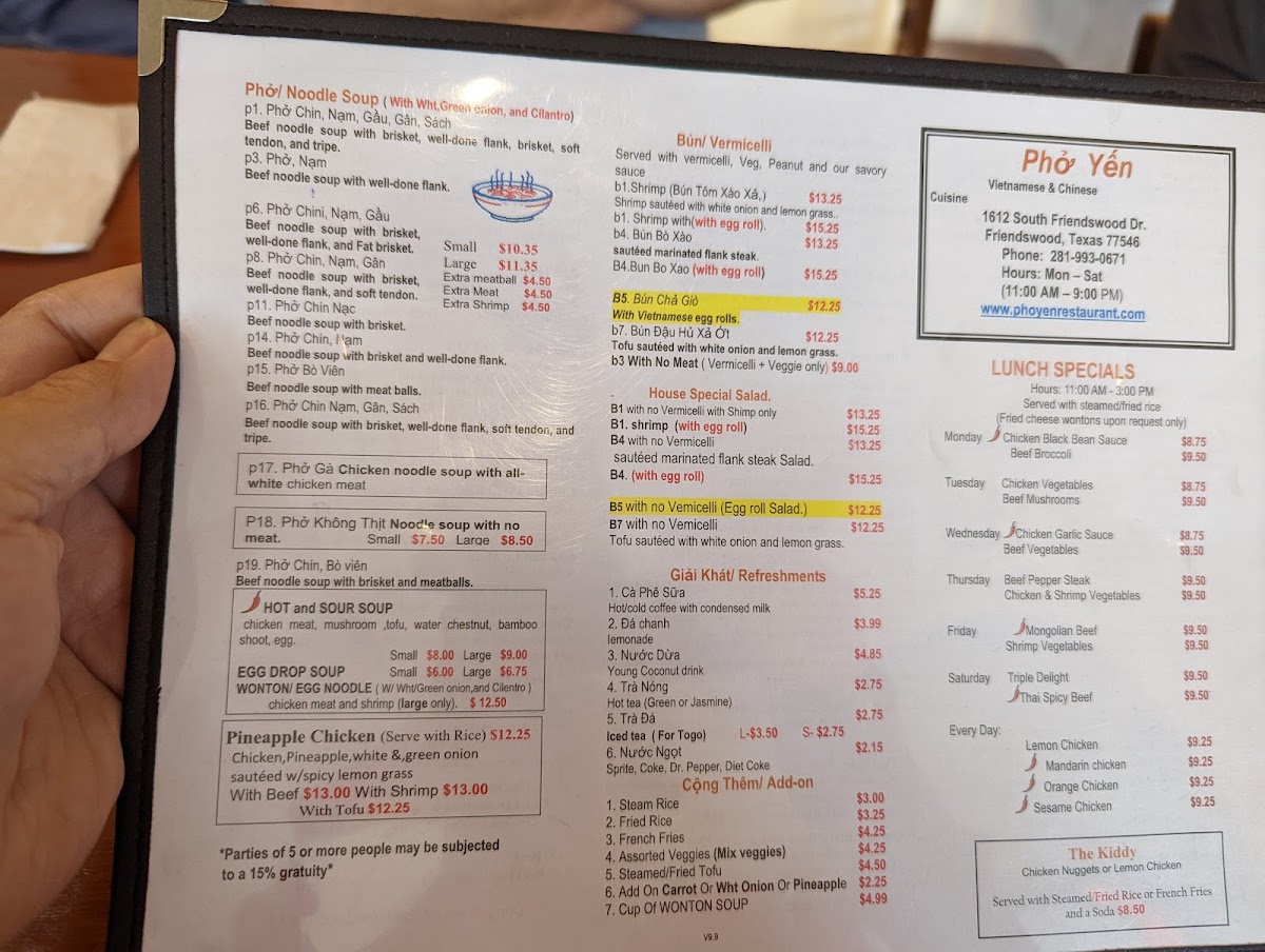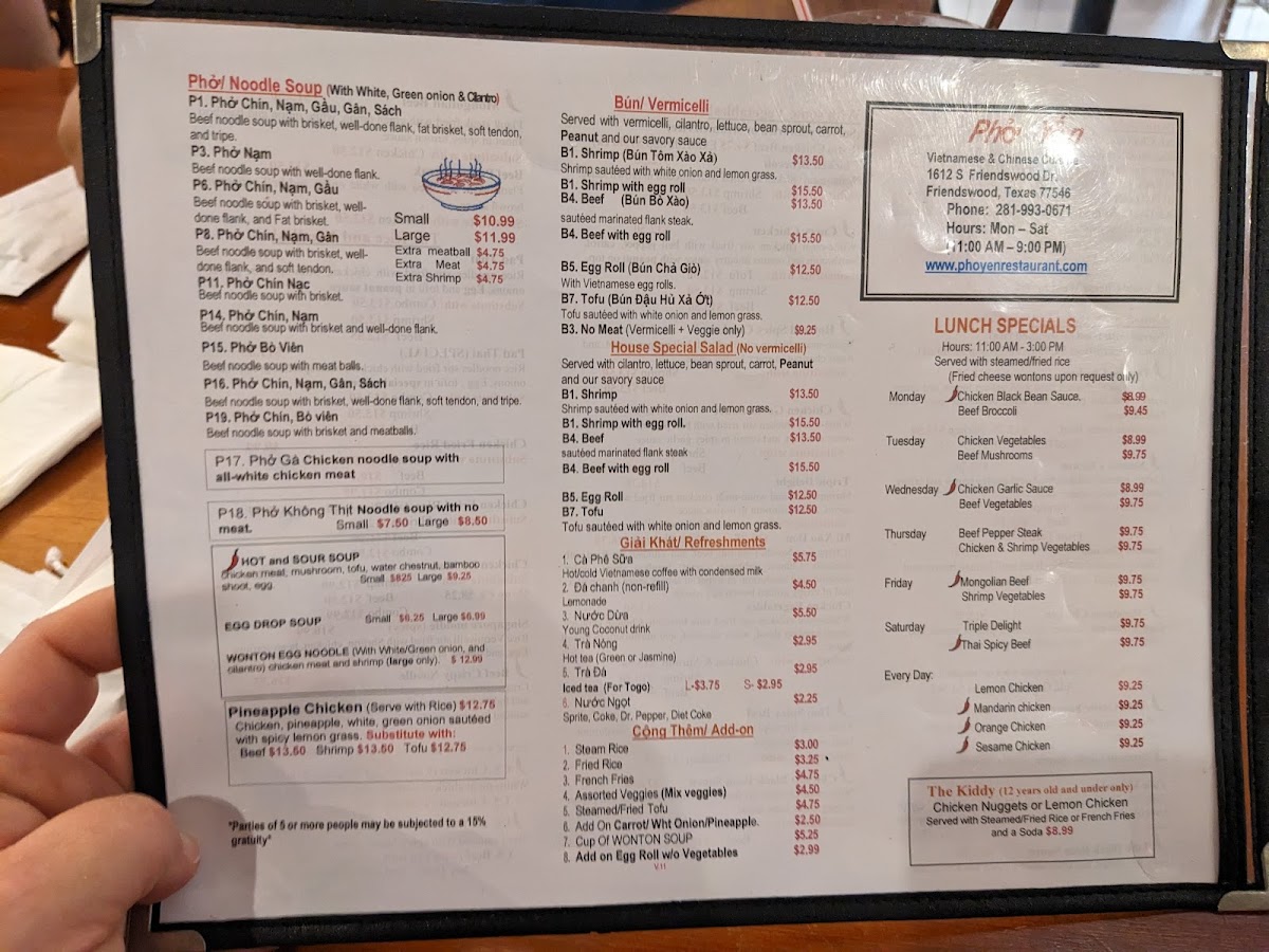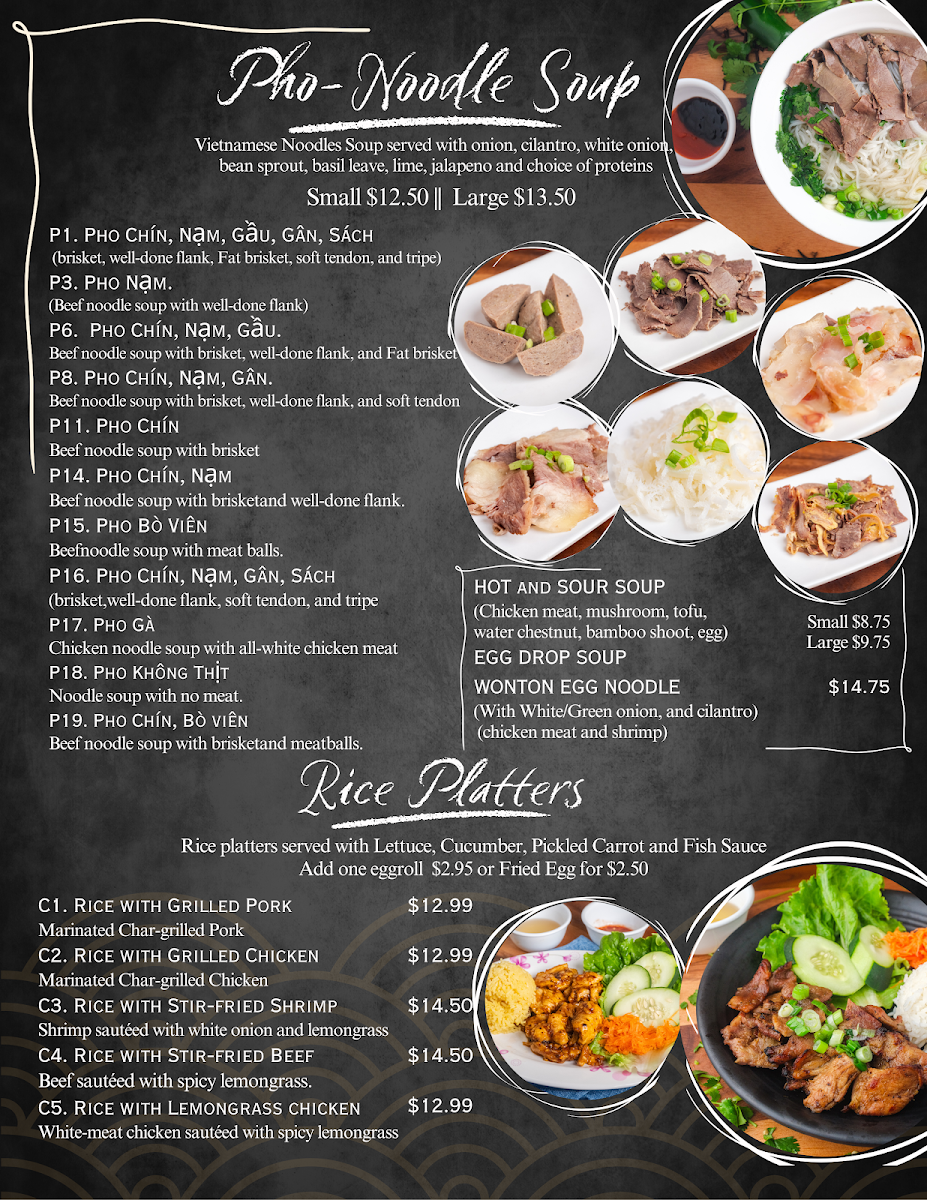 Phở Yến Vietnamese & Chinese Cuisine Menu